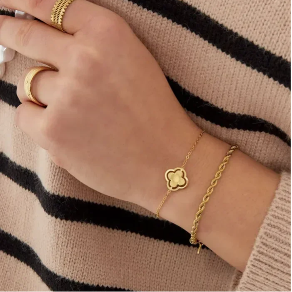 Hoe mega leuk is deze gouden armband in een schattige look met een dubbel klavertje. Te leuk om deze armband te combineren met meerdere sieraden met klaver details. De armband is verstelbaar vanaf 16 tot en met 19 cm en daardoor superleuk om cadeau te geven. Daarnaast is de armband gemaakt van stainless steel. Verkrijgbaar in de kleuren goud en zilver.