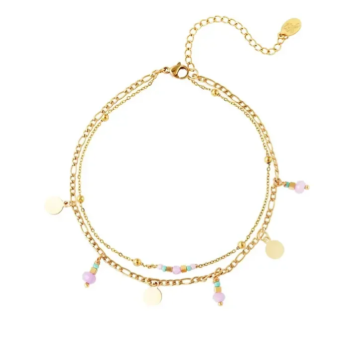 Upgrade je summer look met dit prachtige dubbel gelaagde enkelbandje! ๐ Met fijne kraaltjes en speelse bedels is dit sieraad de perfecte mix van elegantie en zomerse vibes.