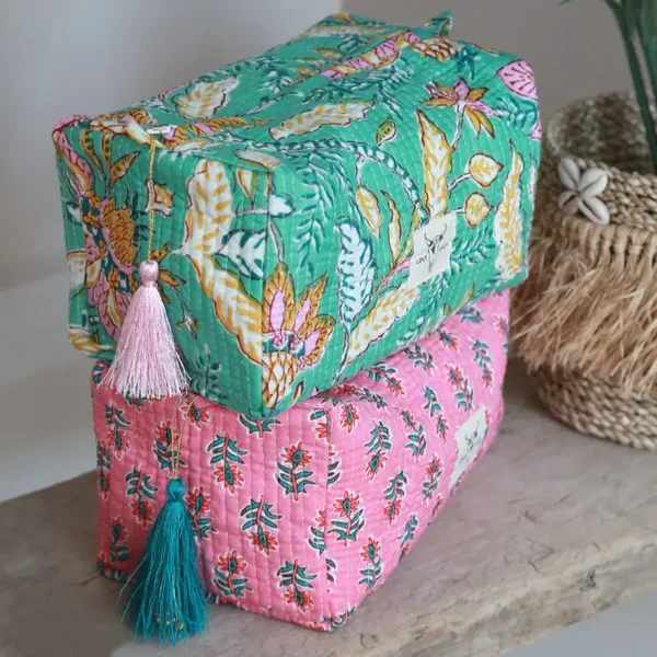 In deze kleurrijke blockprint katoenen toilettas kun je al je toiletartikelen en makeup overal mee naartoe nemen. Deze toilettas met ristssluiting is gemaakt van organisch katoen heeft een gecoate binnenvoering met 4 binnenvakjes.