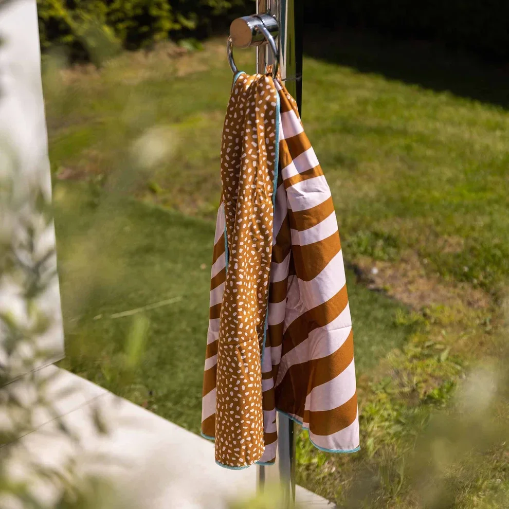Een lekker zomers Oranje Vibrant Stripes printje, dat staat toch perfect bij de zomer? Een strandlaken is een musthave voor aan het zwembad of het strand. Dit Microvezel Strandlaken is gemaakt van 100% gerecycled microvezel en is dus lekker snel drogend en fijn. De voorkant heeft een Vibrant Stripes printje, de achterkant een zacht stippen printje. Zo kun je nog eens omdraaien voor wat afwisseling! Het strandlaken heeft een afmeting van 135 x 65 cm.
