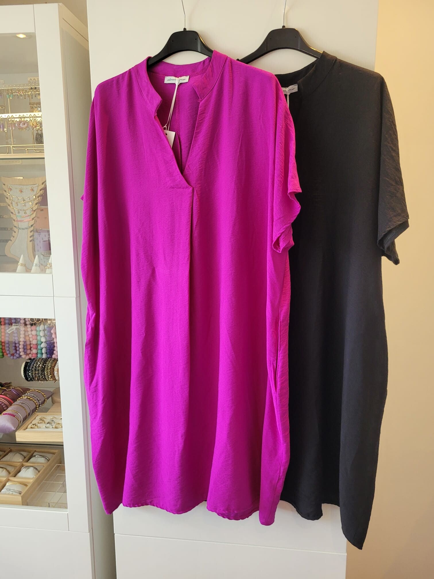 Deze populaire Long V-dress, nu in een kortere variant! Gemaakt van 100% viscose, voelt de stof heerlijk licht en luchtig aan – perfect voor zomerse dagen. Het ruime ‘aangooi’-model is ideaal voor wie houdt van comfort én stijl.